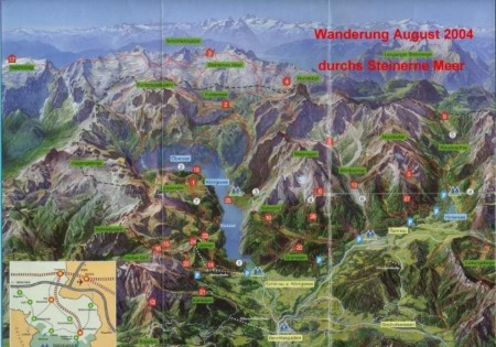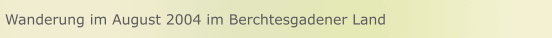 Mein Freund Ad und ich unternahmen im August 2004 eine Wanderung in das Steinerne Meer, ausgehend von Ramsau Wimbach Brücke durch das Wimbach Tal über Wimbach Schloss zur Wimbach Gries Hütte. Übernachtung. Am nächsten Morgen weiter über den Trichübel Pass - Hundstod Gatterl - Hundstod Scharte - zum Ingolstädter Haus auf der Dießbach Scharte. Übernachtung. Weiter durch das Steinerne Meer zum Kärlinger Haus am Funtensee. Brotzeit. Über den Röth Weg, vorbei am Grün und Schwarzsee, Halsköpfel zu der einsam gelegenen Wasseralm. ( Sehr rustical ). Übernachtung. Nach dem guten Frühstück weiter auf dem Röthweg zur verfallenne Fischunkel Alm weiter zur Gotzen Alm. Übernachtung. Von der Gotzen Alm über den Feuerpalfen ( herrlicher Tiefblick auf St. Bartholomä 1140 m ) über die Königsbach Alm zum Schneibstein Haus. Übernachtung. Wir wollten noch weiter über die Kühroint Alm zum Watzmann Haus und zur Blaueis Hütte, aber leider hörte es nicht auf zu regnen und wir haben die Tour nach einem regenreichen Abstieg nach Berchtesgaden beendet und sind mit dem Zug nach Hause gefahren. Es war eine landschaftlich sehr reizvolle Tour. Einige Bilder finden Sie unter dem Button Bilder.