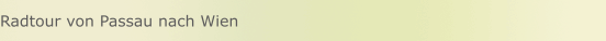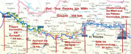 Vom 17. bis 23. Juli 2008 unternahm ich eine Radtour von Passau nach Wien. 1. Tag: Von Passau Kernmühle nach Aschach 65 km 2. Tag: Von Aschach nach Mitterkirchen 74 km 3. Tag: Von Mitterkirchen nach Spitz 88 km 4. Tag: Von Spitz nach Klosterneuburg 90 km 5. Tag: Von Klosterneuburg nach Wien zum Westbahnhof 34km mit dem Zug zurück nach Passau